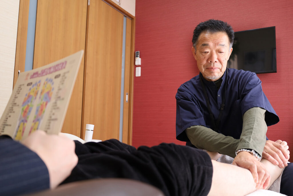 足裏の反射区を強めの圧で刺激し、さらに膝下まで丁寧に流すことで溜まった疲れを一気にリセットします。